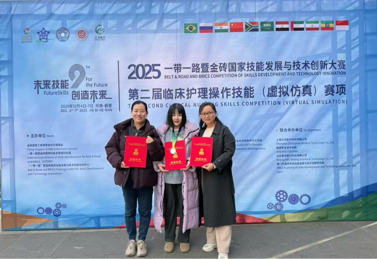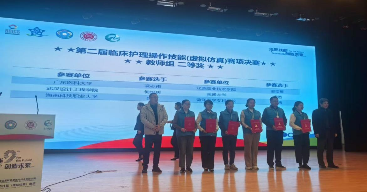 2025年12月5日至7日,2025一带一路暨金砖国家技能发展与技术创新大赛“第二届临床护理操作技能(虚拟仿真)赛项决赛”在河南鹤壁职业技术学院隆重举行。本次大赛参赛院校涵盖了985、211本科院校以及众多中高职院校,经过激烈角逐,我校教师团队凭借扎实的专业功底和出色的教学能力,在教师组混合式教学设计赛项中荣获全国二等奖,充分展现了我校护理专业教师队伍的教学水平和创新实力。